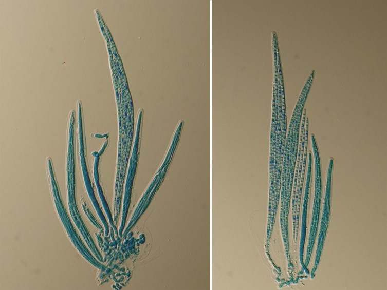 Ascospores whole, non-fragmenting, 80–100 × 1.5–2 μm, blunt at upper end tapering to base.