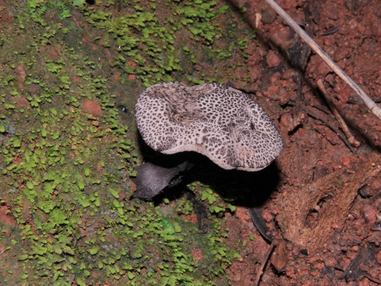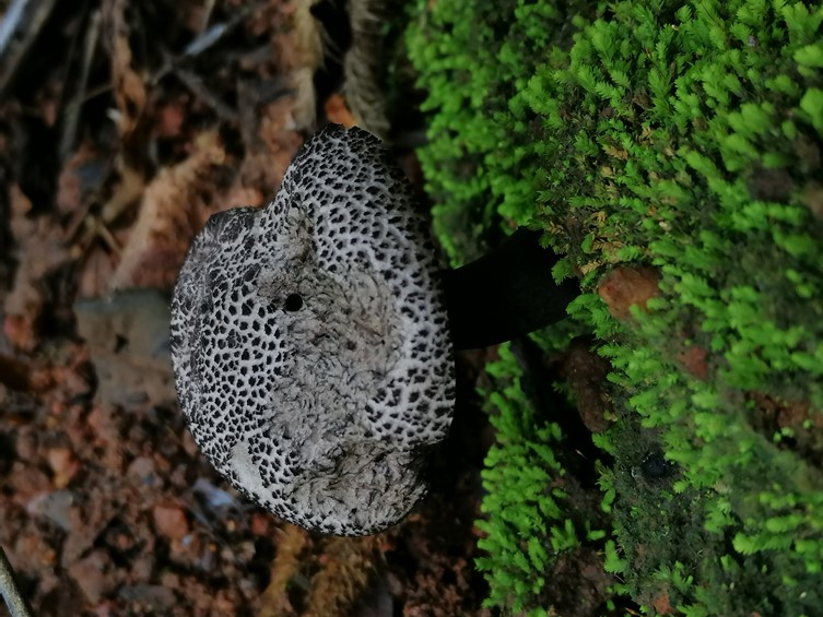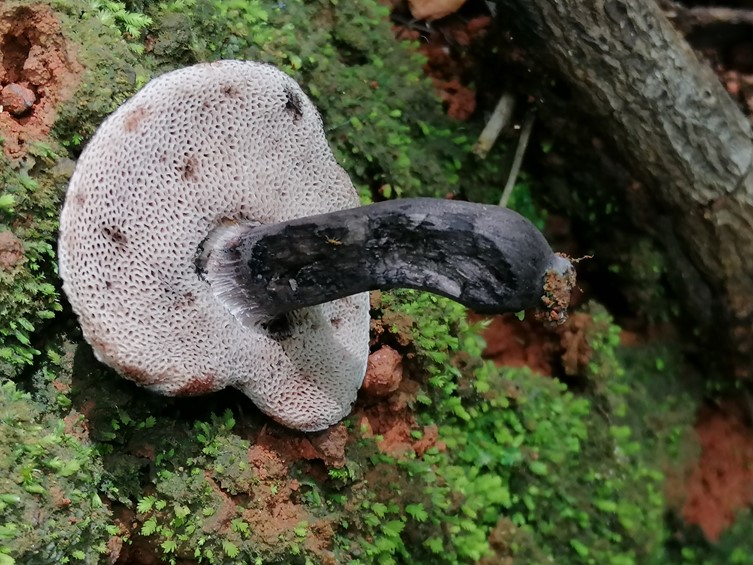 Basidiocarp 40 mm diam, initially convex, surface dry, squamulose, light greenish grey with black squamules, becoming black slowly when bruised or with age, margin entire, encurved. Pileus surface orange with 3% KOH and phenol but unchanging with FeSO4 and 3% NH4OH. Pore surface depressed near the juncture of stipe with age, yellowish grey or paler when fresh, slowly becoming moderate yellowish pink with maturity, becoming initially black to charcoal when brushed, turning to orange with 3% KOH, pores 2-3 per mm angular, simple. Tubes adnate, 4-5 mm long, pinkish white to greyish red becoming black on 5 minutes after exposure. Stipe 30 × 8 mm, insertion central, cylindrical to clavate, becoming narrow towards base, smooth, reticulation absent, dark greyish purple, unchanging with chemical reaction. Context up to 7 mm wide in pileus, yellowish white on exposure, quickly becoming dull red, unchanging with chemical reaction. Spore print not observed.