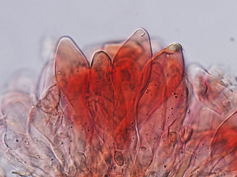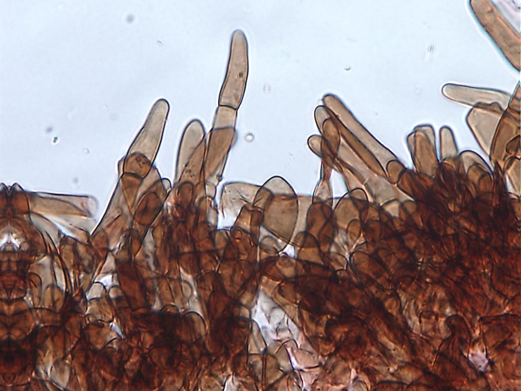 cheilocystidia 30.0-45.0 × 10.0-17.5 μm, frequent, narrowly lanceolate with rounded to capitate apex, thin-walled, hyaline to pale yellow. Hymenophoral trama divergent, hyphae septate, up to 10 μm wide. Pileipellis a trichoderm, 250-350 μm thick, composed of erect to suberect, loosely interwoven unbranched to rarely branched hyphae, 7.5-20.0 µm wide, septate, thick-walled, pale brown to brown.