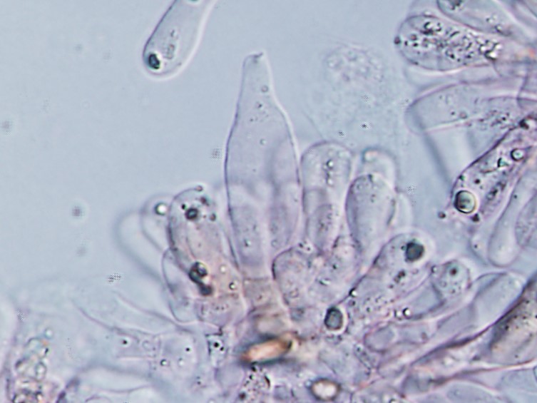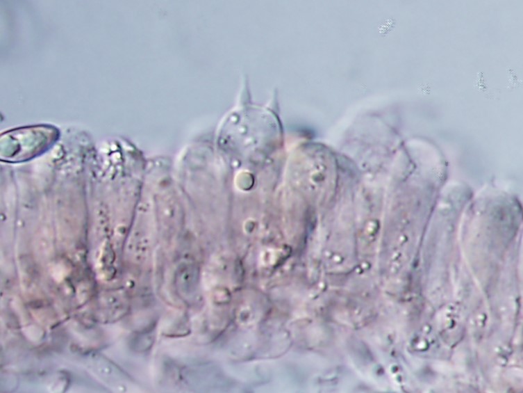 Pleurocystidia 55.0-67.5 × 15.0-20.0 µm, rare, lanceolate to ventricose, thin-walled, hyaline. Subhymenial layer up to 10 μm thick, pseudoparenchymatous. Tube edge fertile with basidia and cystidia,