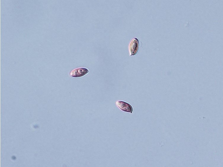 Basidiospores 10.0-12.5 × 5.0-5.5 µm, cylindrical, subfusiform to fusifrom, inequilateral, thin-walled, smooth.