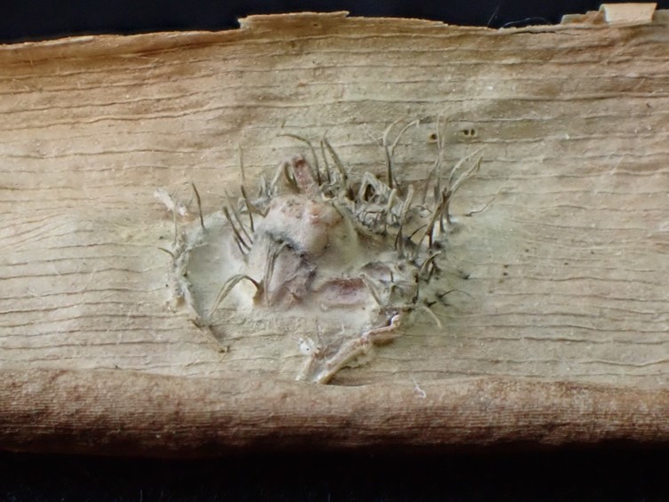 Stroma of grayish mycelium completely covering the host. Synnemata numerous erect, clavate, grey, up to 3 mm high, 60-70 mm diam.