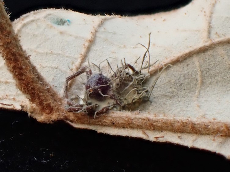 Specimens were found on small hunting spiders attached to the underside of living leaves of forest plants.