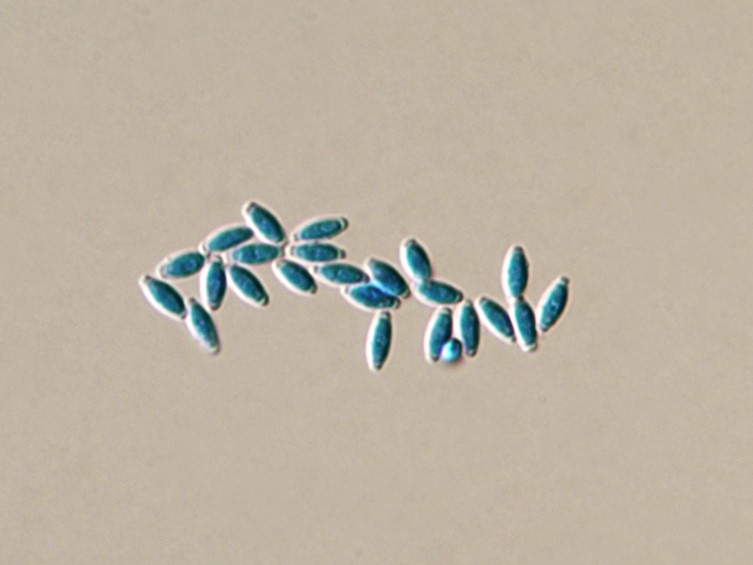 Conidia catenate, one-celled, smooth-walled, hyaline, clavate, 3.5-5.5 × 1-1.5 μm.
