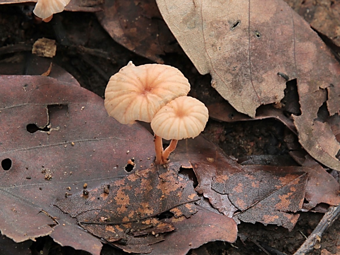 Basidiocarps small. Pileus 20–35 mm diam, broadly convex to flat; moderate orange yellow, margin involute to decurved, entire, sometimes crenate. Lamellae sinuate, thick, distant, colored like pileus, moderate yellowish pink. Stipe 40–60 × 0.3–0.8 mm, moderate orange or moderate yellowish pink slightly tapering toward the apex, solid, minutely fibrillose over entire length.