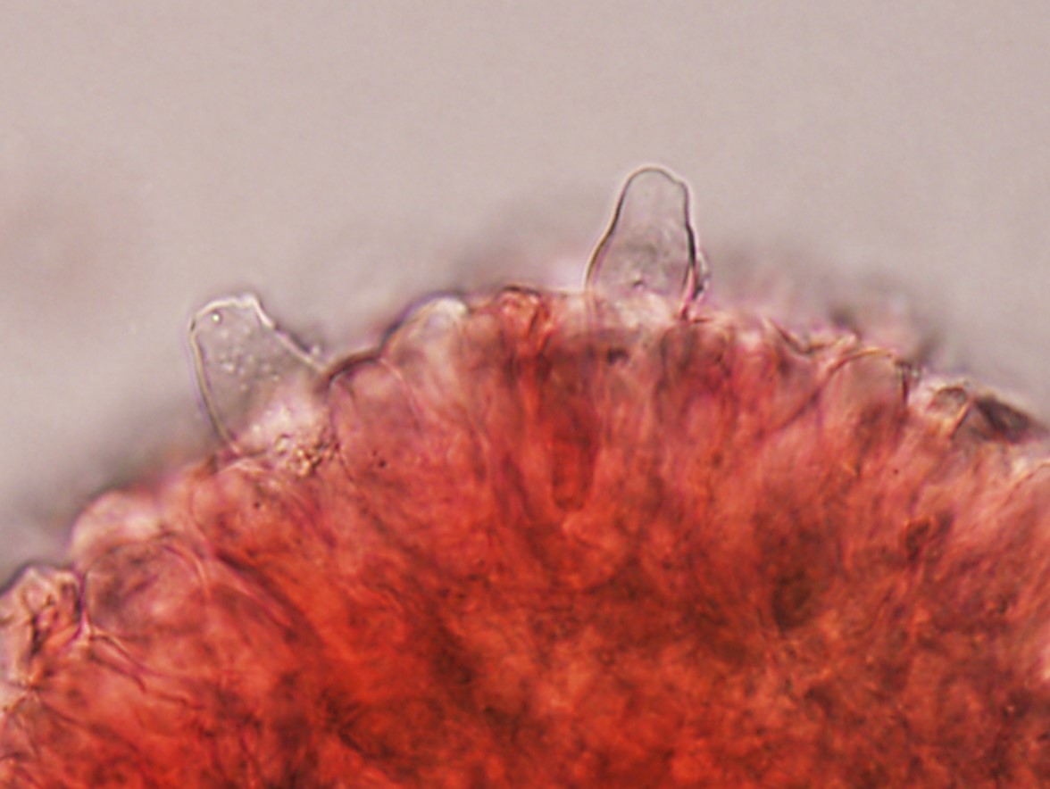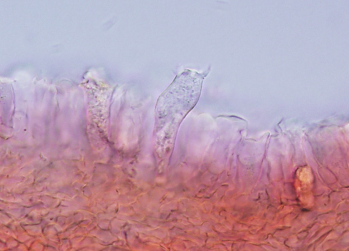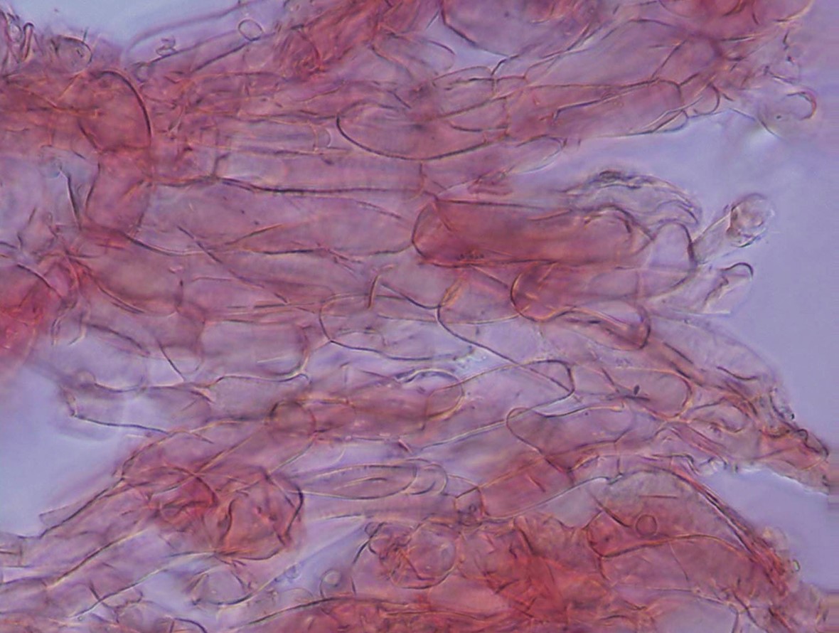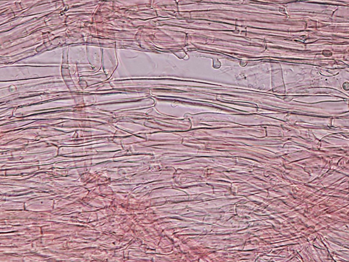 Basidia 35–42.5 × 10–12.5 μm, 4-spored, clavate, mature sterigmata up to 6–10 μm long, hyaline. Cheilocystidia absent. Pleurocystidia 20–31.0 × 3–8 μm, filamentous, hyaline. Stipitipellis composed of parallel, cylindrical, repent, hyaline hyphae. Caulocystidia absent. Pileipellis composed of interwoven, cylindrical, mostly repent, hyaline. Lamellar trama of subparallel to interwoven, cylindrical, repent, hyaline hyphae; subhymenium undifferentiated. Clamp connections present all tissue.