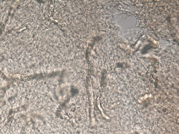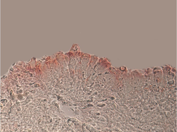 Basidia 35–75 × 10–15 µm, subclavate to clavate, mostly 4-spored but 1- and 2-spored basidia also present, sometimes with granular or guttate contents; sterigmata 2.5–10 × 1–3 µm. Pleuromacrocystidia absent. Pileipellis 35–80 µm thick, containing pale brown, intracellular pigmentation, composed of long and slender terminal elements, 2–6 µm, cylindrical, subfusiform, sometimes subclavate. Stipitipellis a cutis or trichoderm, 30–75 µm thick, hyaline.