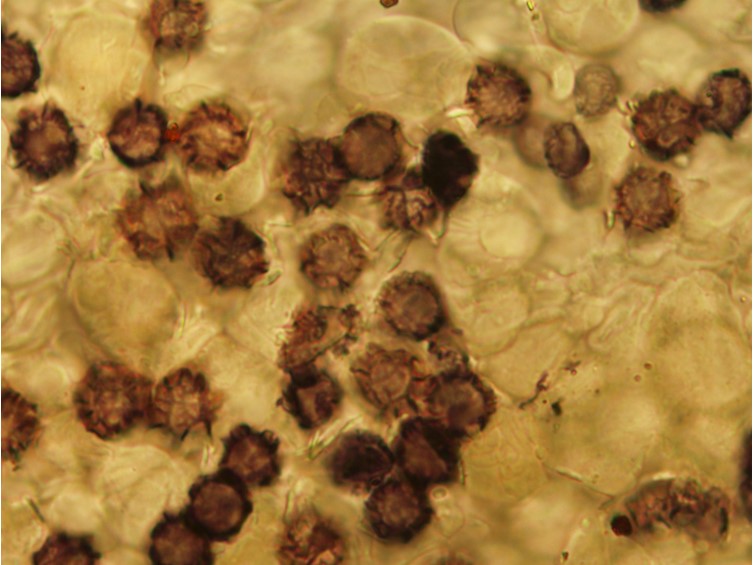 Basidiospores 7–8 × 6.75–7.5 µm, globose to subglobose; ornamentation amyloid, a somewhat dense but incomplete reticulum with various free terminal ends, composed of rather irregular ridges that are 1.5 µm high, more or less acute, sometimes with a split appearance and mostly irregularly crenulate edges; numerous isolated warts and short ridges present; plage distally amyloid.