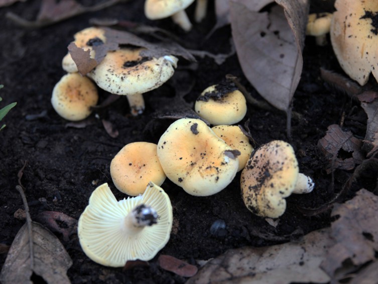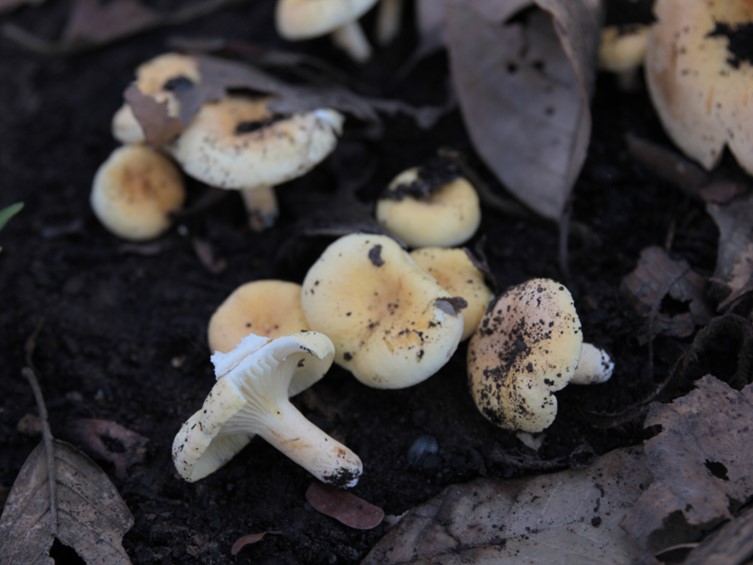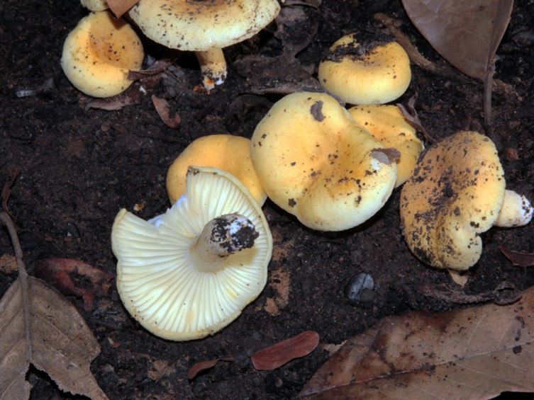 Pileus 12–60 mm diam, pulvinate, convex to plano convex with depressed at centre, light orange yellow, light yellow, brilliant yellow to vivid yellow, not staining when bruised, KOH negative on cap surface; margin arched; surface smooth, dry, firm. Lamellae adnexed, some forked near stipe, subdistant unequal, some crisped, pale yellow, not staining when handled. Stipe 10–40 × 5–12 mm, regular and cylindrical, slightly tapering downwards, stuffed; surface smooth, dry, pale yellow, not staining when handled. Context firm and thick, white to cream, 2–4 mm wide, KOH negative, Latex not abundant, whitish, milky. Odour indistinct. Taste unrecorded.