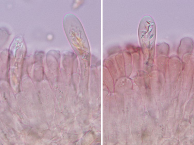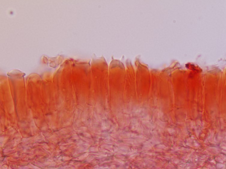 Pleurocystidia 37.5–45 × 10–17.5 μm, subclavate to clavate, thin-walled. Cheilocystidia absent. Lamellar edge fertile. Lamellar trama 20–100 μm wide, composed of numerous and hyphae; sphaerocytes, lactiferous hyphae contain needle-like to granular or crystal, 2.5–10 μm wide. Subhymenium 7.5–12.5 μm thick, composed of slender cylindrical cells up to 10 μm wide under basidia. Hymenophoral trama consists of isodiametric sphaerocytes and hyphae, 27.5–87.5 μm thick. Pileipellis intermixed with laticiferous hyphae, 3.75–8.75 μm wide, aseptate, thin-walled, and hyaline hyphae 2.0–13.8 μm wide, septate, thin-walled. Stipitipellis composed of sphaerocytes and lactiferous hyphae, 2.5–10.0 μm wide, hyaline. Clamp connections absent.