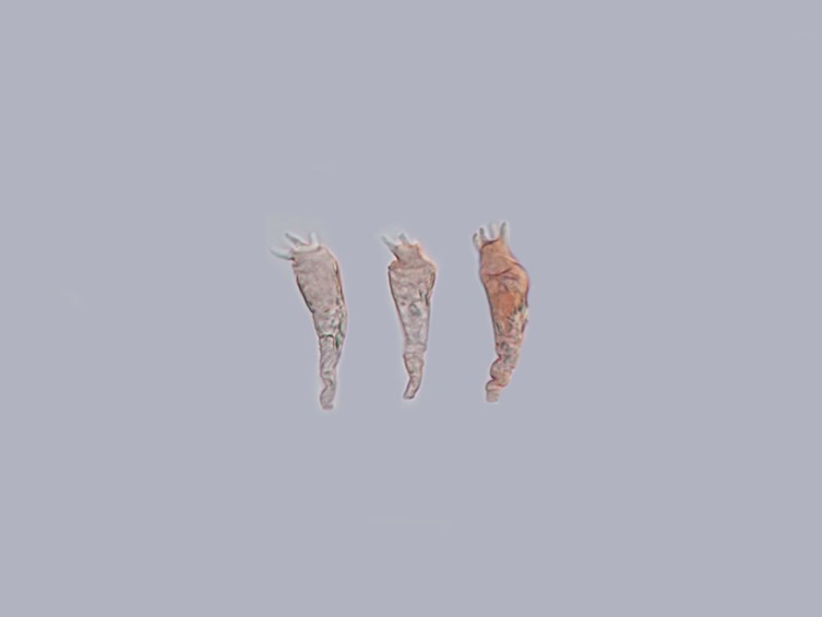 Basidiospores broadly ellipsoid to ellipsoid, 8.8–10.0 × 3.8–8.8 μm; ornamentation amyloid, composed of isolated warts, up to 1 μm tall; plage distinct and often weakly centrally to distally amyloid.