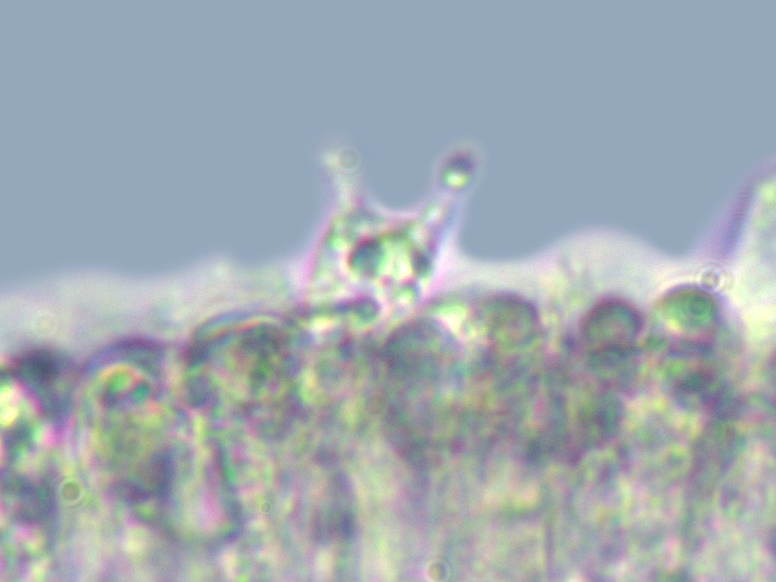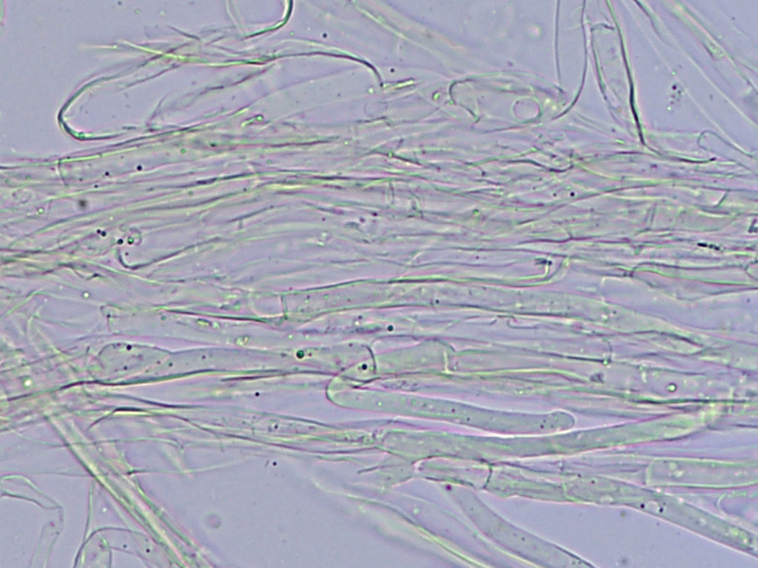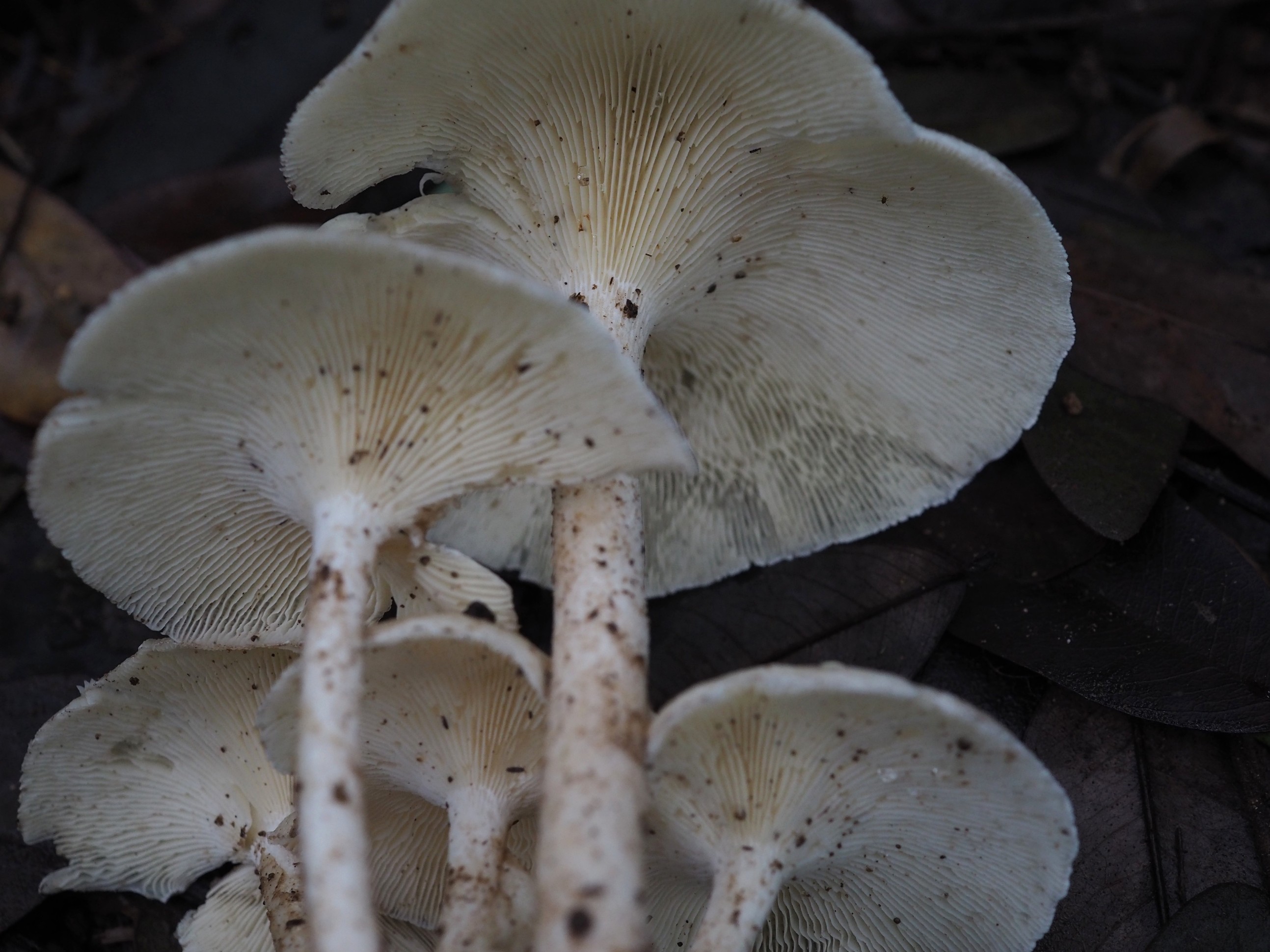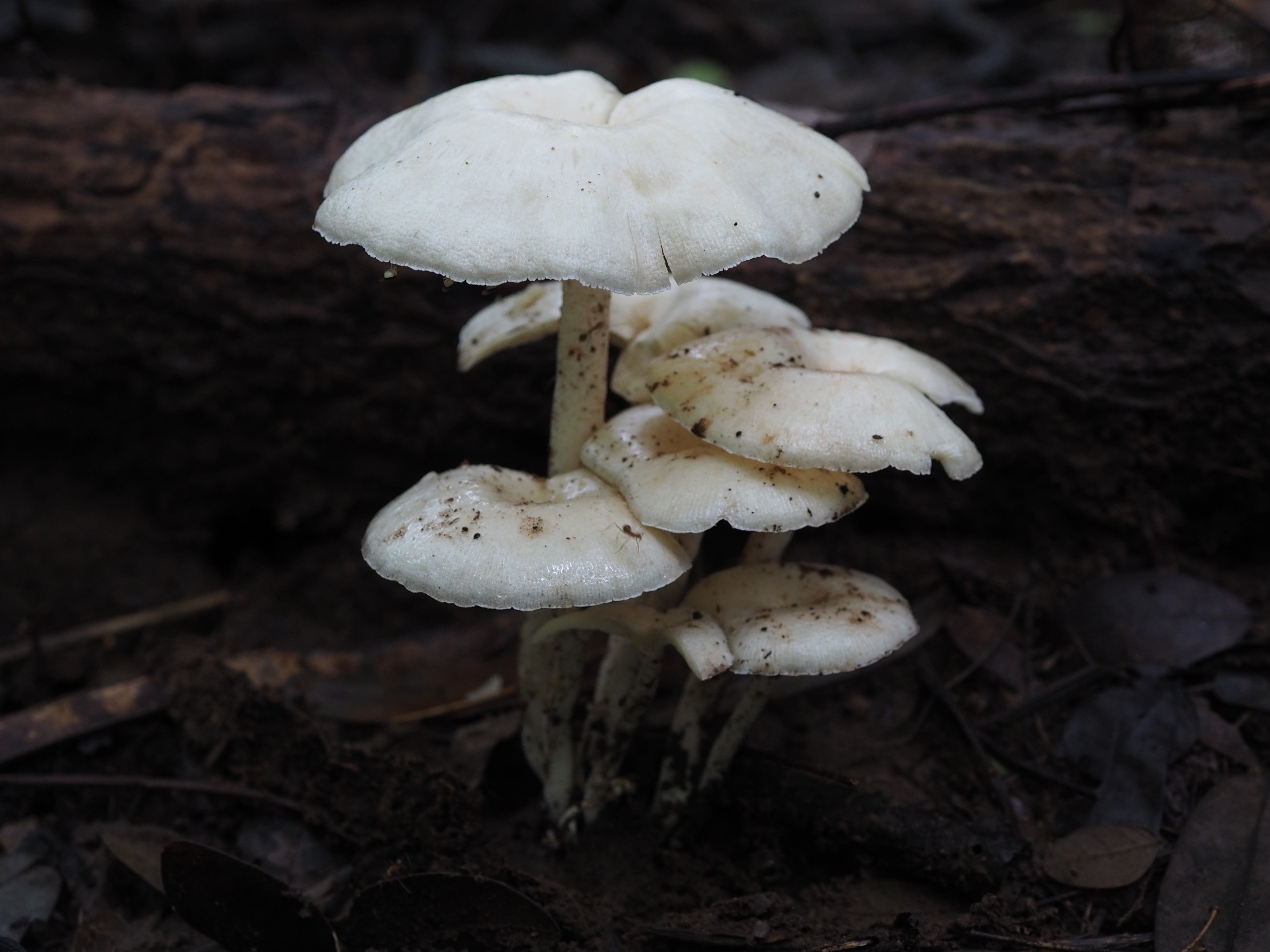 Basidiomata connate, 10–85 mm diam., initially convex, expanding to applanate and often infundibuliform or deeply depressed at the disc; surface ornamented with densely arranged, concentrically disposed fibrillose squamules, most crowded at the center and radiating toward the margin; coloration white to yellowish-white. Margin even to fissile at maturity, bearing whitish fibrillose elements. Lamellae decurrent, white throughout, narrowing distally, up to 2 mm broad, with entire, smooth edges. Stipe central to occasionally lateral, 20–90 × 2.5–10 mm, cylindrical, equal or slightly tapering toward the base; surface white to yellowish-white, either glabrous or adorned with whitish to yellowish fibrillose covering. Annulus absent. Context white in pileus and stipe, firm and coriaceous to leathery in consistency; hyphal system dimitic, composed of generative and skeletal elements. Generative hyphae hyaline, thin- to moderately thick-walled, with clamp connections, frequent throughout tissues. Basidiospores 5–6 × 3–4 μm, broadly ellipsoid to ellipsoid, occasionally subelongate, smooth, thin-walled, hyaline, inamyloid. Basidia 16–26 × 5–6 μm, clavate, thin-walled, hyaline, bearing four sterigmata, sterigmata reaching up to 5 μm in length. Pileipellis 2.0–8.8 µm wide, branched and septate, hyaline to pale yellow, skeleton hyphae 1.5–5.0 µm. Stipitipellis 2.5–10.0 µm wide hyaline to yellow, branch, septate.Clamp connections abundant in all tissues.