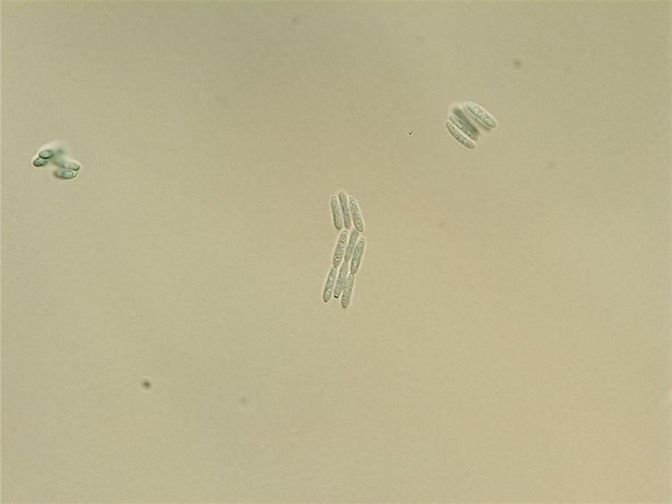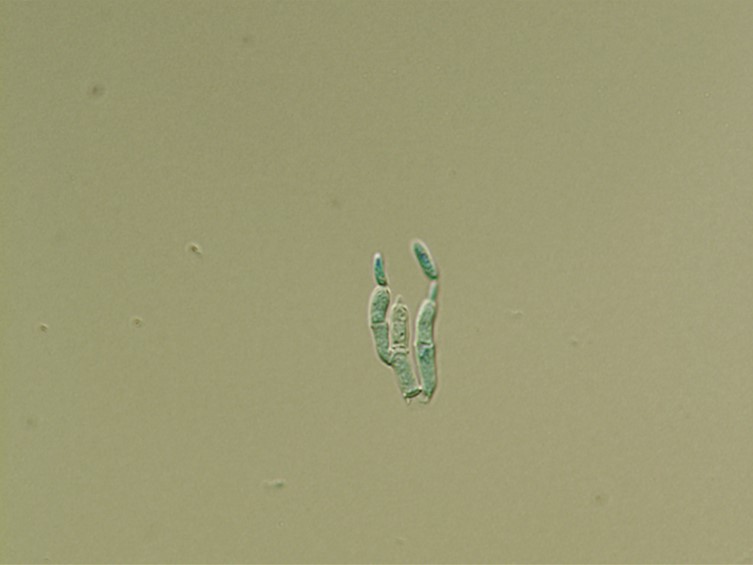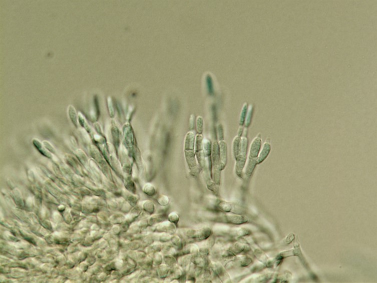 Host covered with pale green mycelium and sporulating conidiophores. Conidia smooth-walled, pale green, cylindrical with rounded apices, 7-10 × 2 μm.
