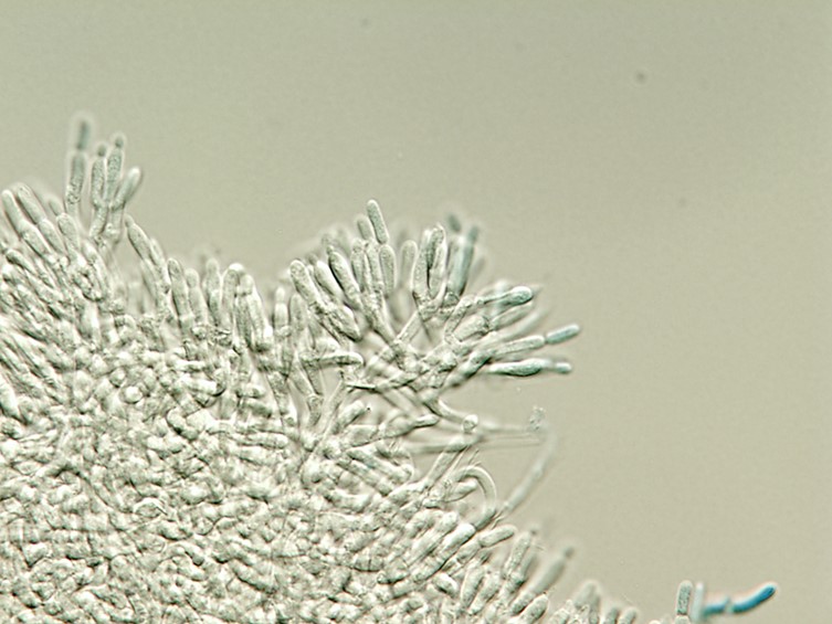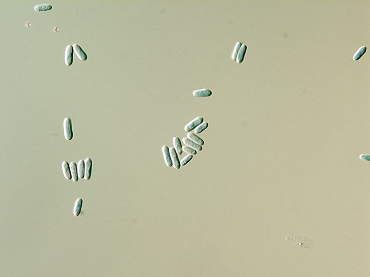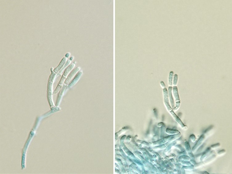 Conidia smooth-walled, parrot green, broadly fusoid, 5-6 × 2-3 μm.