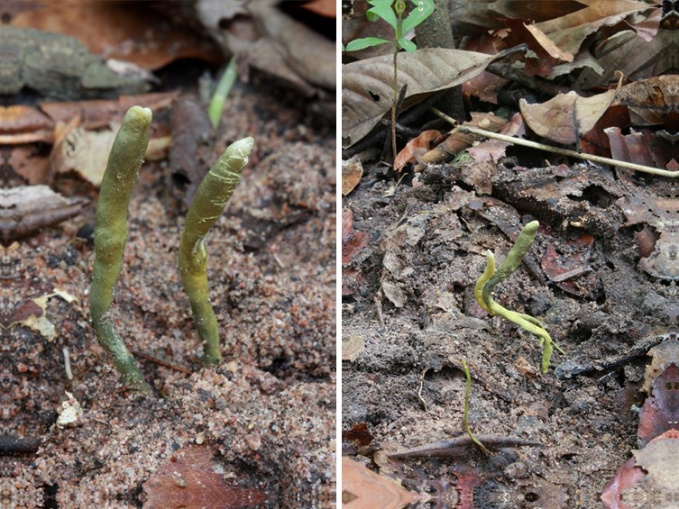 Stromata simple to sparingly branched, yellow brown when young turning olive green to greenish brown with age, dark green ostioles. Rhizoids flexuous, up to 30 cm buried deep in the ground. Stipe of the stroma brownish yellow to olive green, up to 0.5 cm broad. Sterile stipe emerging from the ground, cylindrical, mustard yellow to olive green, 3-5 cm long, 0.5 cm wide. Fertile part clavate, 25-30 × 3-5 mm.