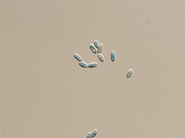 Host covered with green powdery conidia. Conidia smooth-walled, cylindrical, ellipsoidal, ovoid, 4-6 × 2-2.5 μm.
