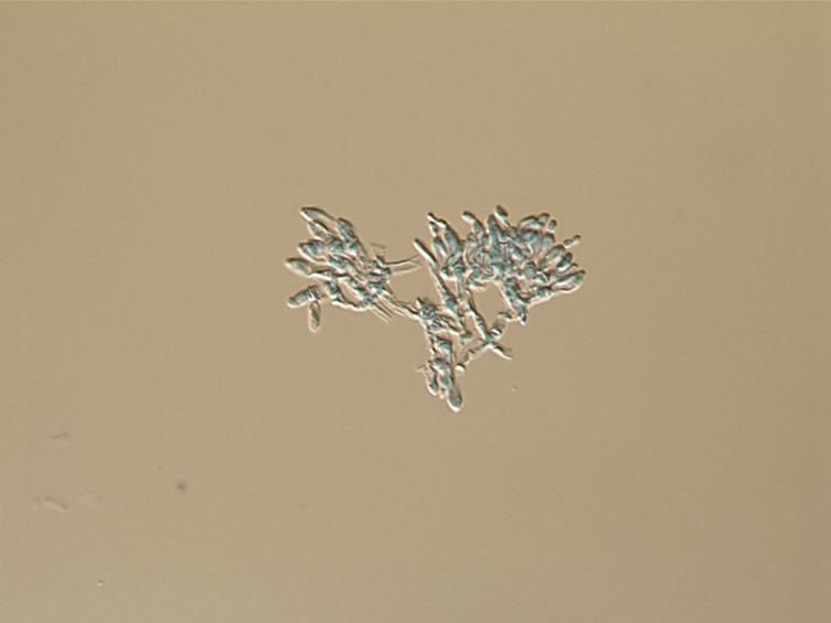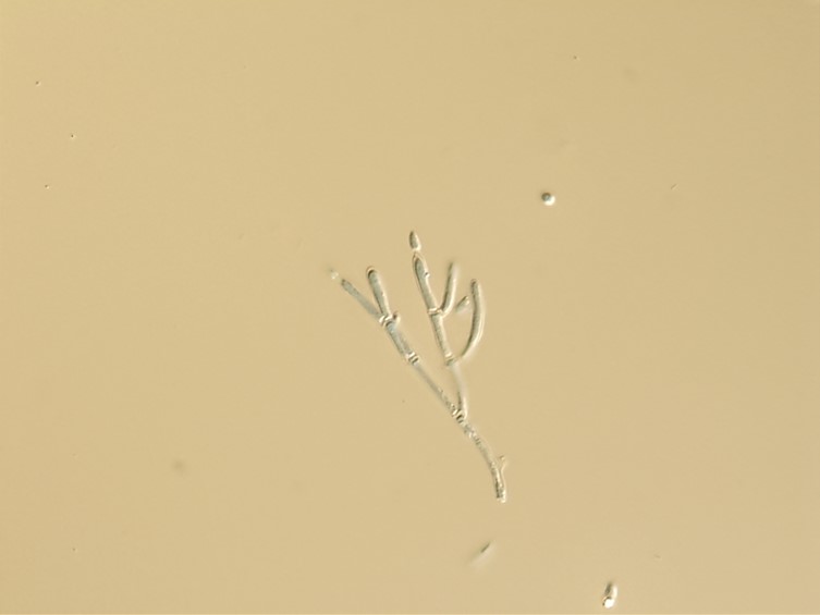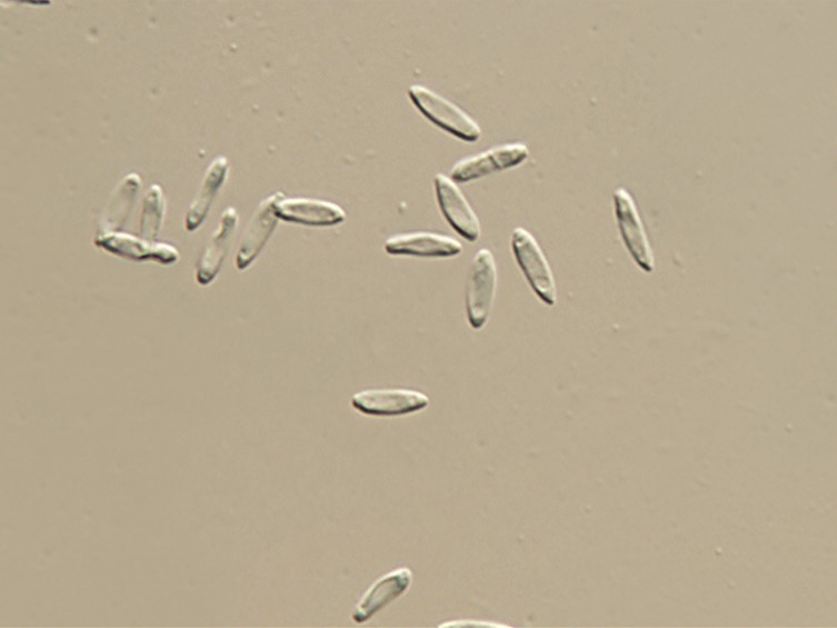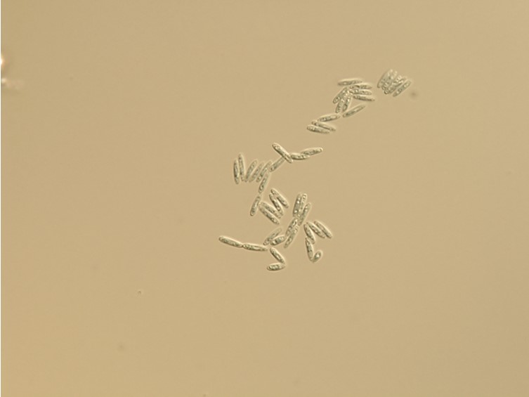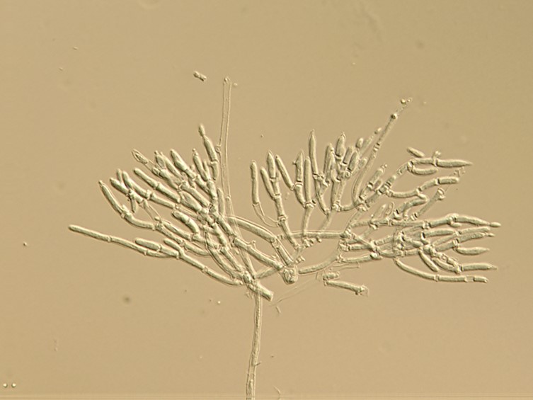 Phialides smooth-walled, ovoid with semi-papillate apices, 6-11 × 2-3 μm. Conidia smooth-walled, lime-green, fusiform-elliptical, 5-8 × 1.5-2 μm.