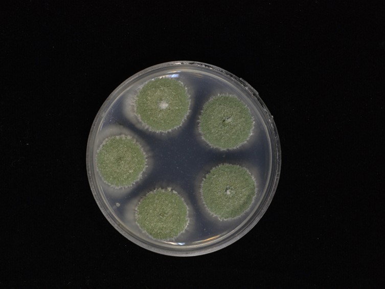Colonies on PDA attaining a diam of 14–15 mm in 14 d, mycelium closely appressed to the agar surface, flat, white at the margins, white turning to parrot-green with powdery conidia while sporulating. Sporulation starts at 3 d after inoculation, reverse white cream. Conidiophores arising from aerial mycelia, erect, smooth-walled. Phialides smooth-walled, cylindrical with semi-papillate apices, 4–6 × 2–3 μm. Conidia smooth-walled, parrot-green, cylindrical with rounded apices or ellipsoidal, 5–7 × 1.5–2 μm.