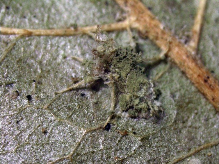 Host covered with pale green mycelium and sporulating conidiophores.