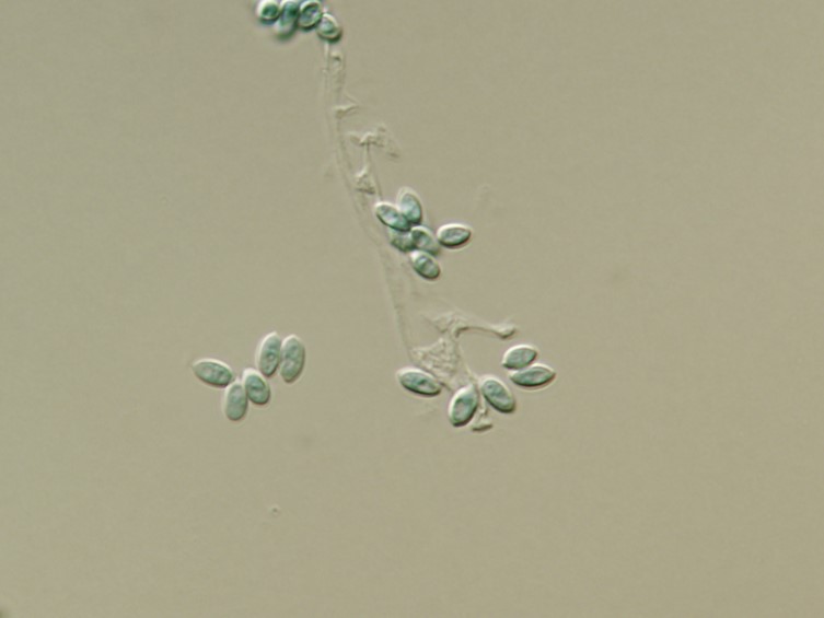 Conidia smooth-walled, parrot green, broadly fusoid, 5-6 × 2-3 μm.