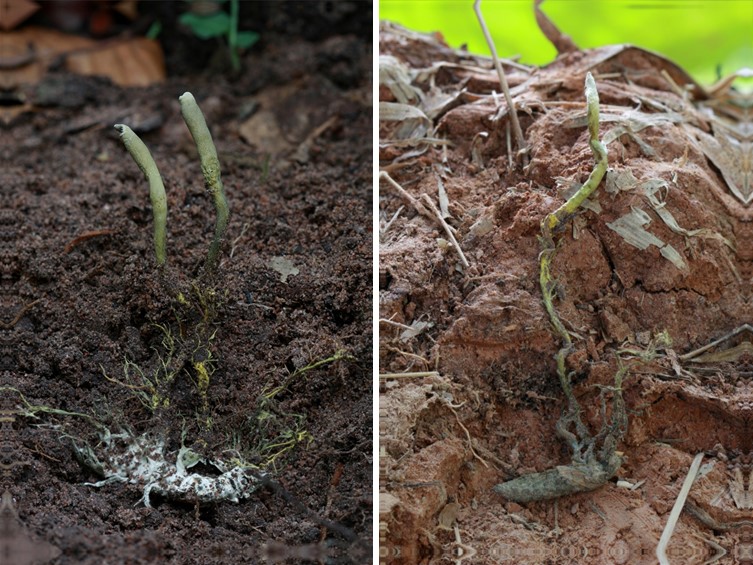 Stromata simple to sparingly branched, yellow brown when young turning olive green to greenish brown with age, dark green ostioles. Rhizoids flexuous, up to 30 cm buried deep in the ground. Stipe of the stroma brownish yellow to olive green, up to 0.5 cm broad. Sterile stipe emerging from the ground, cylindrical, mustard yellow to olive green, 3-5 cm long, 0.5 cm wide. Fertile part clavate, 25-30 × 3-5 mm.