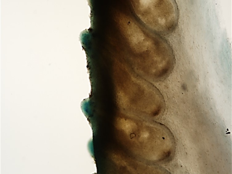Asci hyaline, cylindrical, 500-650 × 4-5 μm, with a prominent apical cap, 5-8 × 3-5 μm.