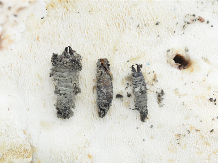 Host’s body covered with white to smoke grey mycelium and powdery smoke grey