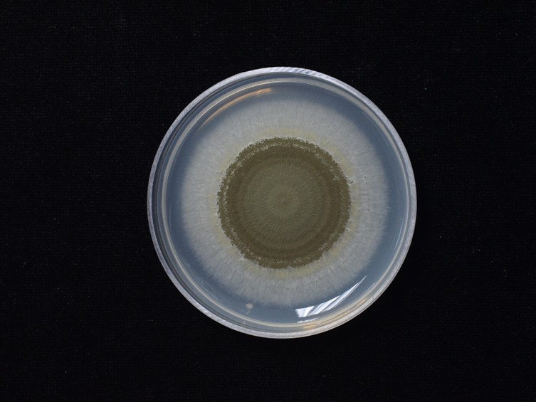 PDA attaining a diam of 25–30 mm in 20 d, white turning to dark green, powdery while sporulating. Sporulation starts at 10 d after inoculation, reverse cream in the middle of colony and white cream at the margin. Conidiophores arising from aerial mycelium, erect, smooth-walled.