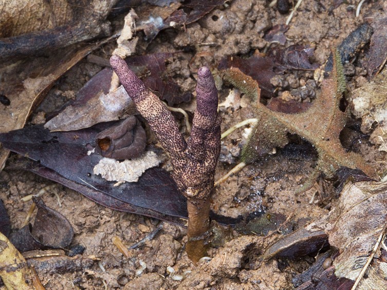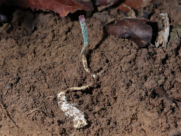Stromata two to eight, clavate, branched, up to 4 cm long, 2.5-3 mm wide. Rhizoids flexuous, arising from region between head and thorax of Coleoptera larva, up to 3 cm buried deep underground. Upper part of the stromata fertile, dark purple, 1-2.5 cm long, 2.5-5 mm wide.