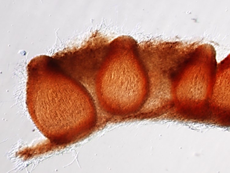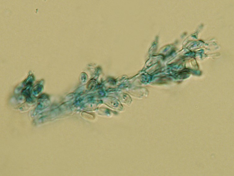 Asci cylindrical, 8-spored, 150-250 × 5-8 μm, prominent apical cap, 5 × 5 μm.