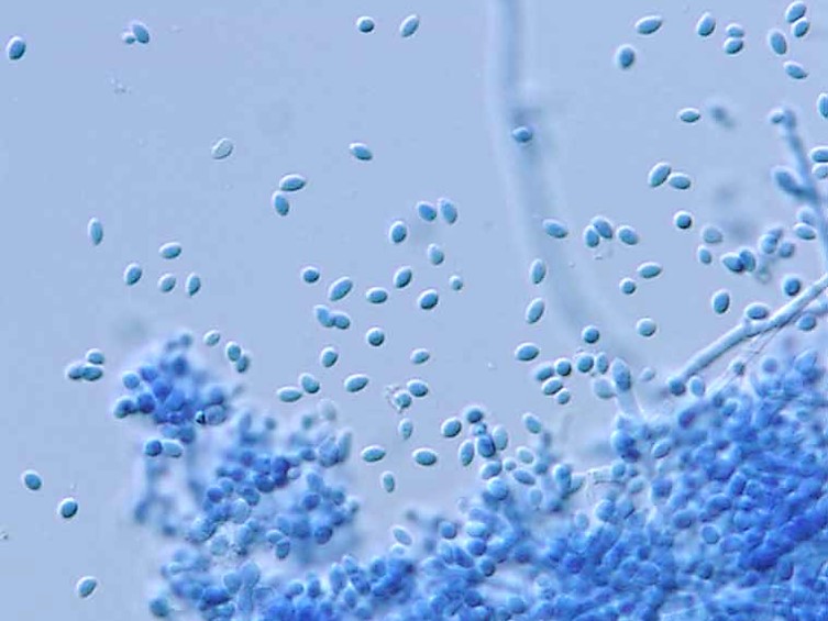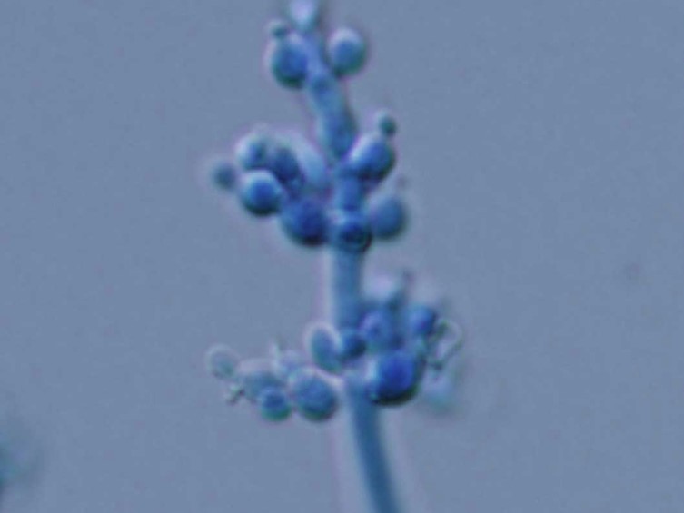 conidia. Hyphae septate, smooth-walled, hyaline, 1.5-3 µm wide, occasionally branched. Conidiophores erect, smooth-walled 2.5-4 µm wide, forming dense clusters of short metulae beneath the septa, solitary or in whorls of 2-6, each bearing 2-6 compacted