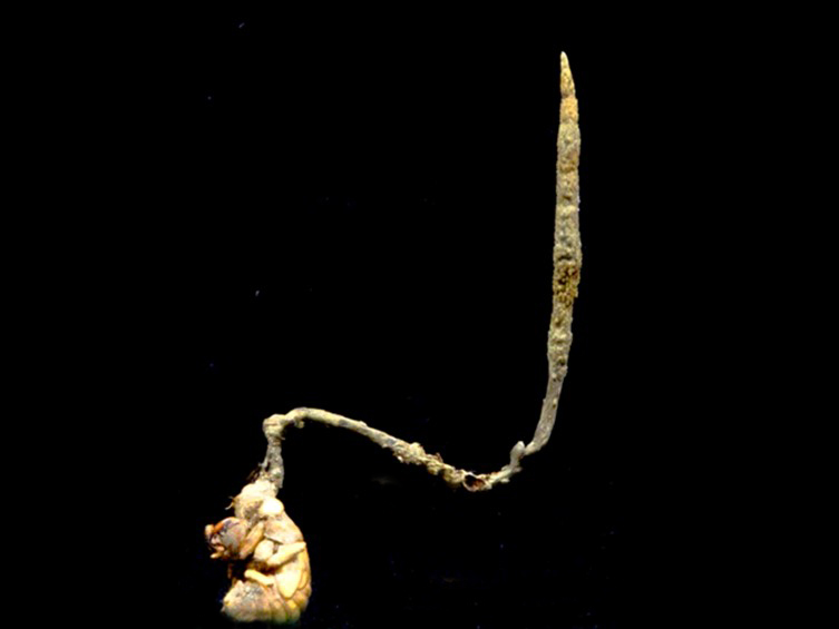 Stromata simple, cylindrical, greyish green to almost dark green arising from the head of the cicada nymphs, 70-130 × 0.6-1.8 mm. Terminal part of the stroma fertile, cylindrical.
