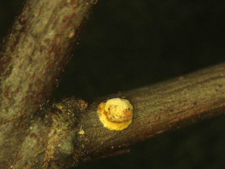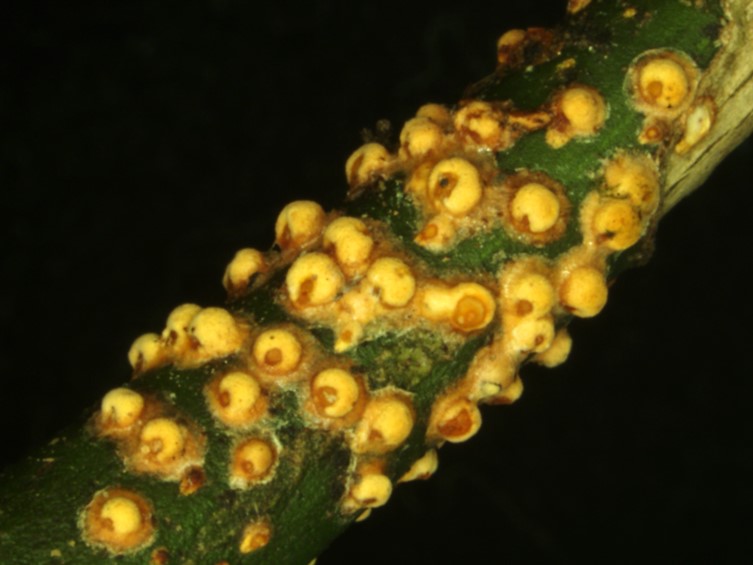 Sexual morph: stromata hemispherical, up to 3 mm in diam and up to 2 mm high, when fresh yellow brown and becoming dark brown when old.