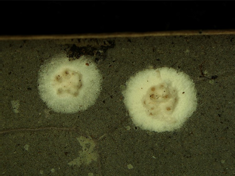 Teleomorphic stromata flat to umbonate, subglobose, 3-3.5 mm in diam, white.