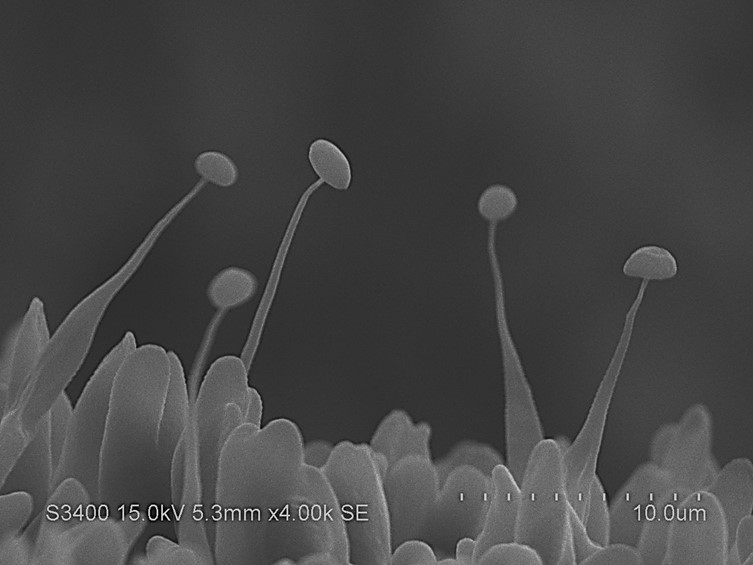 hirsutella-like synanamorph is scattered on the upper surface of the stroma, phialides with a long thin neck, up to 20 μm, 1-2 μm wide, conidia citriform, 2-3 × 1-2.5 μm.