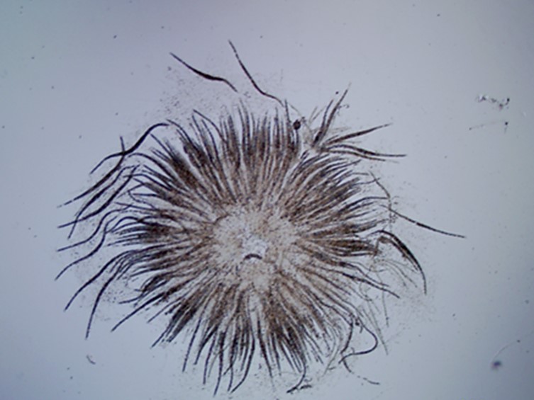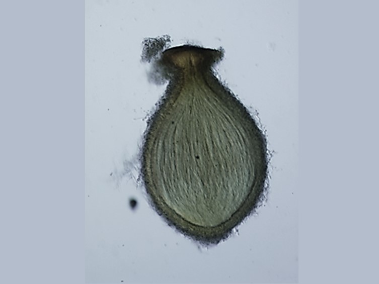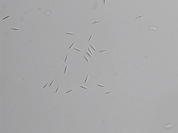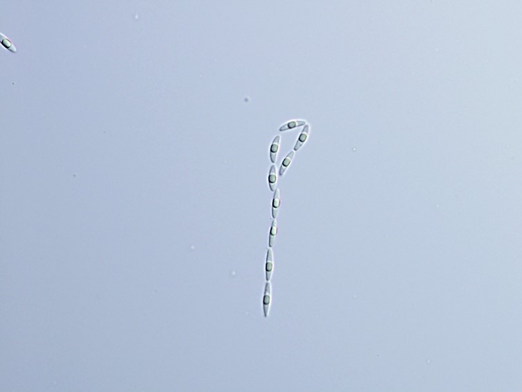 Ascospores divide into part-spores, cylindrical narrow-oval, tapering slightly towards the ends, ends somewhat rounded to obtuse, 10-16 × 2.5-4 µm, sometimes slightly curved.