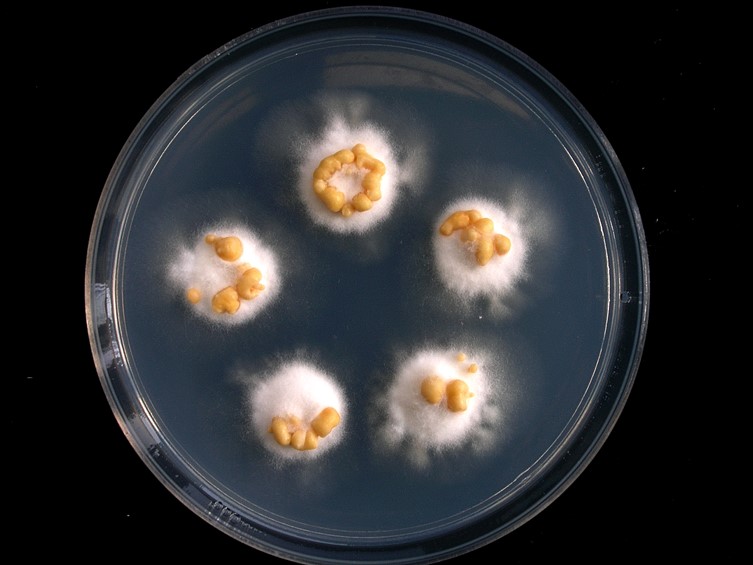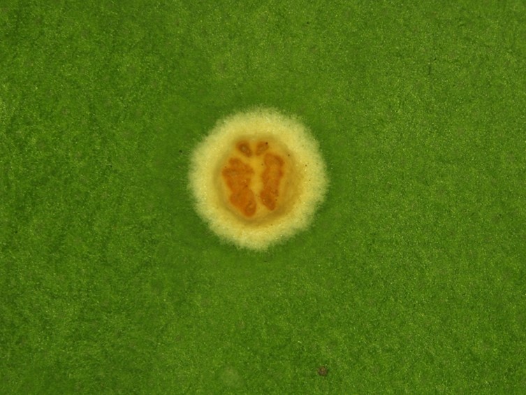 Colonies on PDA attaining a diam of 1 cm diam after 4 wk. The stromatic colonies were white. The yellow to orange colored conidial masses produced a scattered covering over the surface of the stromatic colonies after 4 wk.