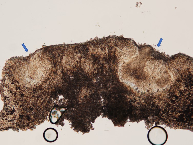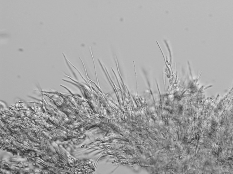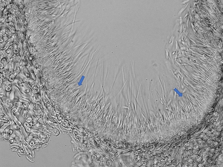 Asci cylindrical, up to 450 µm long, ca 6.5-15 µm diam, with a distinct, thickened hyaline cap 7.5-9 µm long, 7.5-10 µm diam.