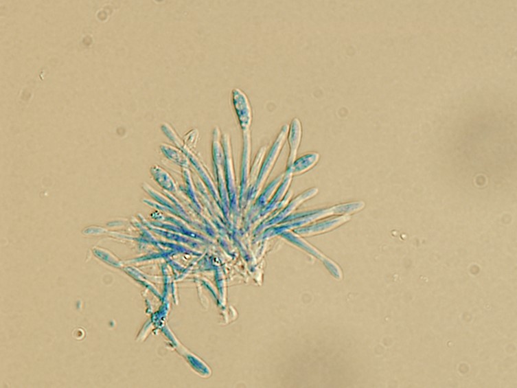 phialides. Phialides slender, up to 25 µm long, ca 1.25 µm wide. Conidia fusoid to broadly fusoid, ends tapering 7.5-10 × 2.5-4 µm.