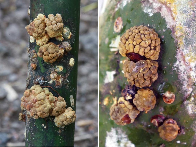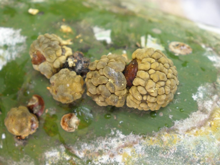 Stromata hemispherical, up to 12 mm diam, 8 mm high. Hywel-Jones and Samuels (1998) described the fresh specimen from Thailand as “strongly botryoso-tuberculate, cerebriform, very hard and resinous when fresh, irregularly furrowed, verrucose or irregularly tuberculate. Exterior color yellowish gray, yellowish brown to gray-brown or buff, becoming carbonaceous blackish brown to black. Interior pale cream-brown or yellow-brown or orange-yellow, becoming chalky white to cream-white.