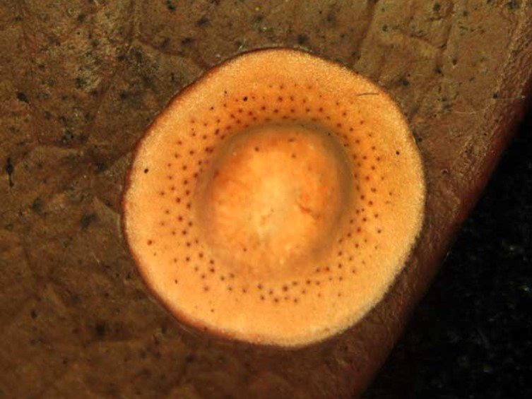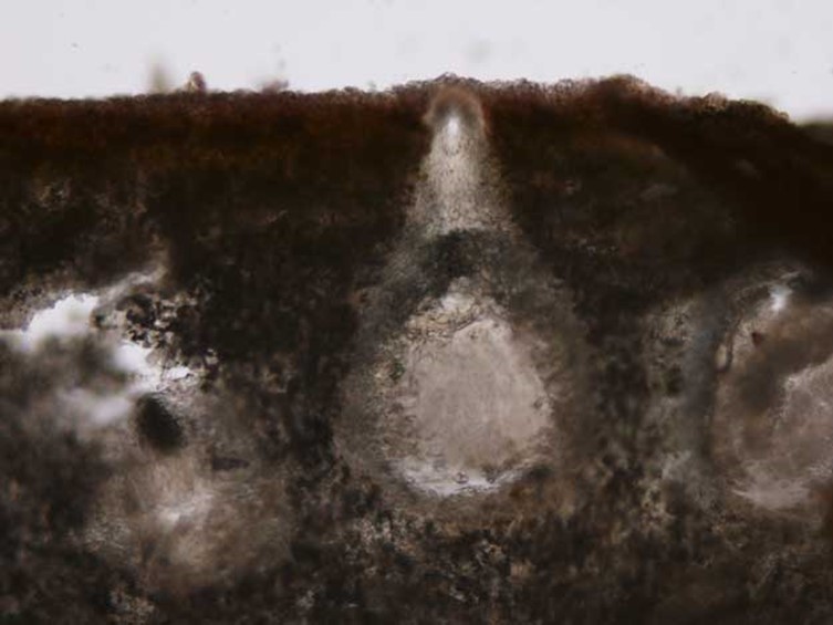 Stroma flattened convex, thick in the center, margin acute, surrounded with red brown ostioles, very hard, brownish orange, up to 10 mm in diam and ca 3.5 mm high. Perithecium completely embedded, flask-shaped, up to 525 μm long, up tp 300 μm wide.