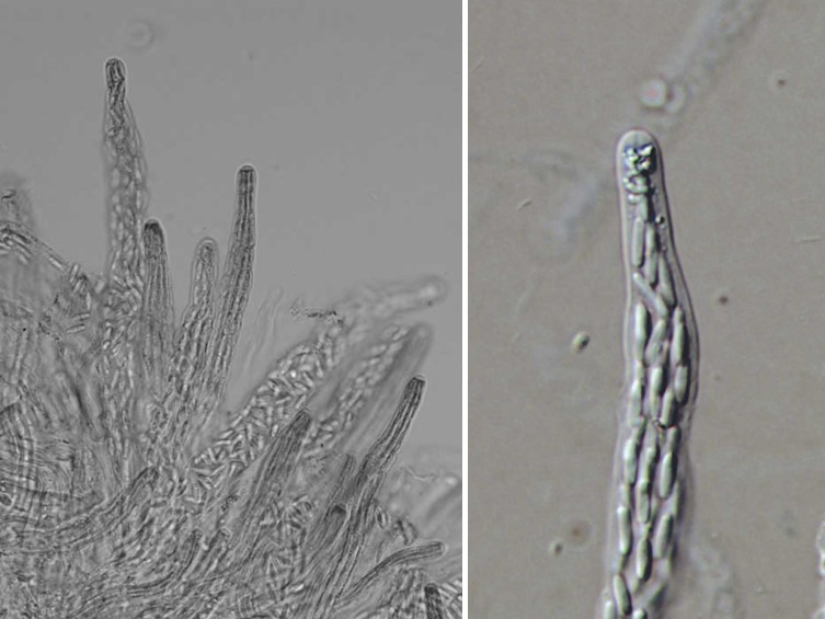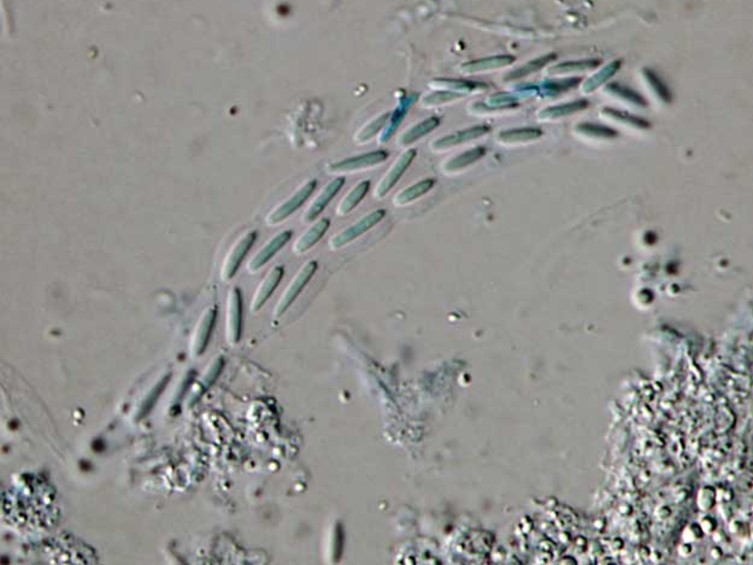Ascospores divide into part-spores, cylindrical with rounded ends, hyaline, 7.5-10 μm long (3-6 μm), 1.5-2 μm wide (1.5 μm). The
