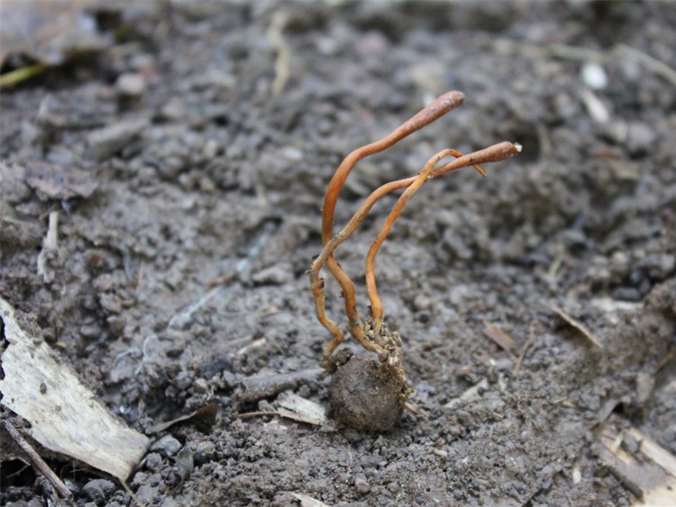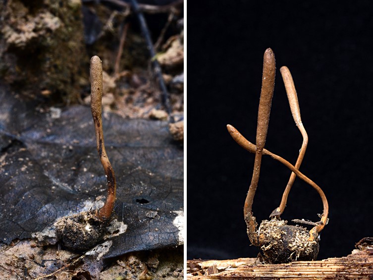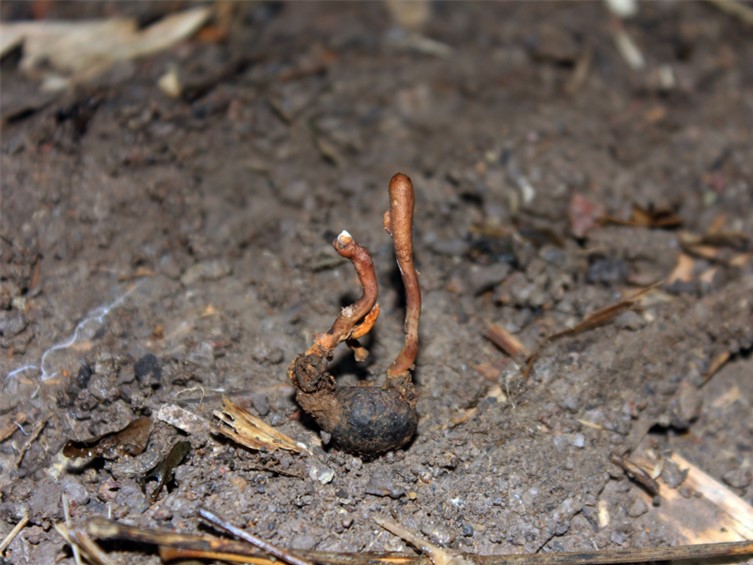Stromata solitary or multiple, unbranched, tough, 20-75 mm long, 0.5-2 mm broad, cylindrical to enlarging apically, arising from the seed buried approximately 5-10 mm underground. Fertile part moderate orange yellow to brown orange, cylindrical to clavate, 5-20 mm long, 1.5-2.5 mm broad.