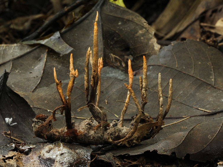 Stromata erect, multiple, cylindric to clavate, simple or branched, yellow-brown to orange, 9-48 × 2-4 mm, becoming purple in 3% KOH.