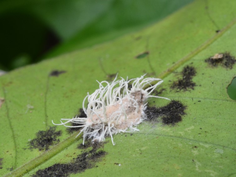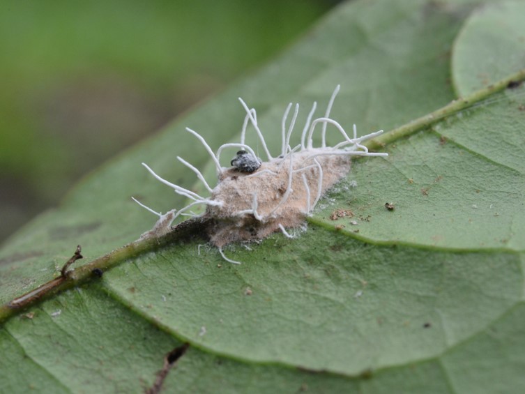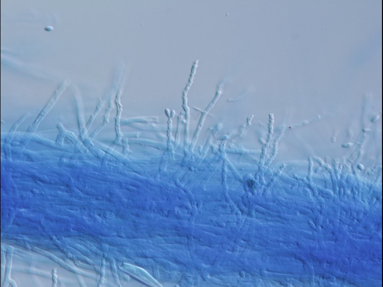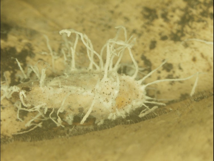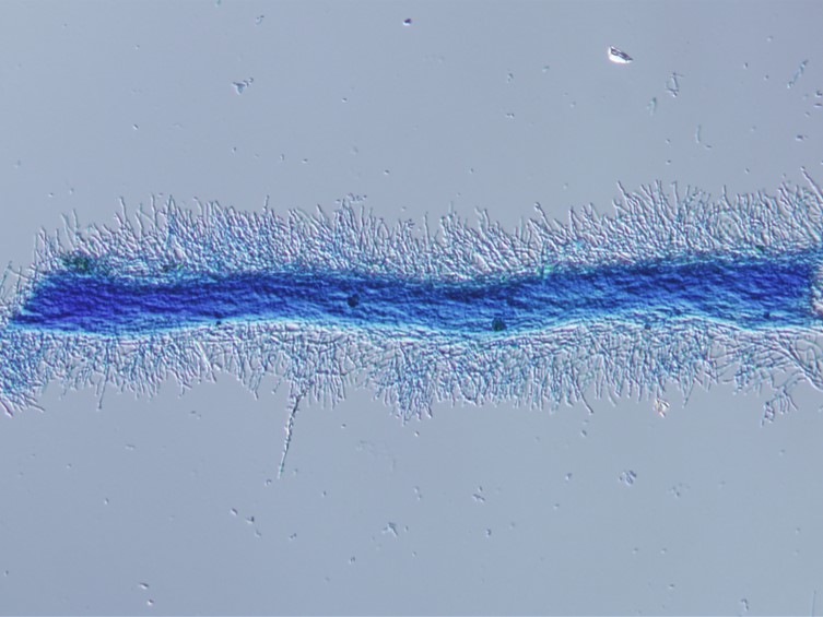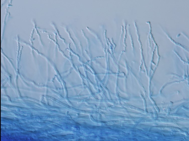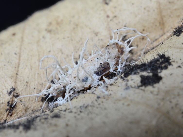 White and cottony mycelium forming on Ophiocordyceps aff. flavida. Hyphae septate, hyaline, smooth-walled, irregularly branched, 1–2 µm wide.