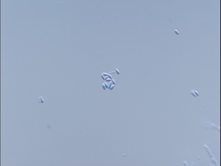 to ellipsoidal with an apiculus, occasionally cylindrical with rounded ends, aseptate, hyaline, smooth-walled, 2–5 × 1–1.5 µm.