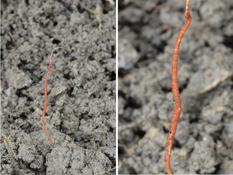 Stroma solitary, simple, filiform, up to 15 cm long, 1 mm wide, orange-brown, ca 10 cm emerging above leaf litter, 5 cm buried in the soil. Asexual state (Hirsutella) produced at the terminal part of the stroma, ca 2 cm long, light brown to grey.