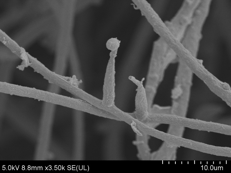 Conidia aseptate, hyaline, smooth, arising from phialides at the apex of each neck, fusiform, 7–9 × 2–3 µm, with a mucous sheath.
