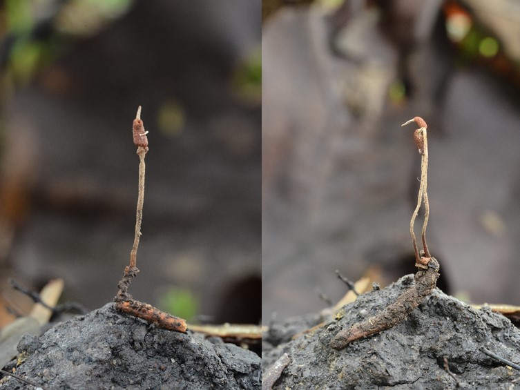 Stromata solitary or in pairs, cylindrical, gradually tapering toward the apex, brownish orange, 20–35 mm long. Stipes cylindrical, smooth, pale yellow, 0.7–1 mm wide. Rhizoids flexuous, 2–3 cm long buried under the ground, arising from head and thorax of Coleoptera larvae.