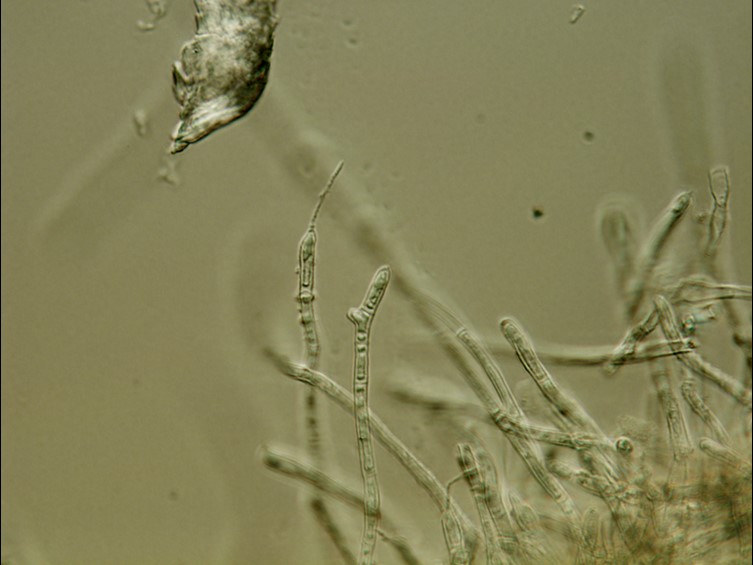 Conidia hyaline, smooth-walled, globose, 2–3 μm diam.